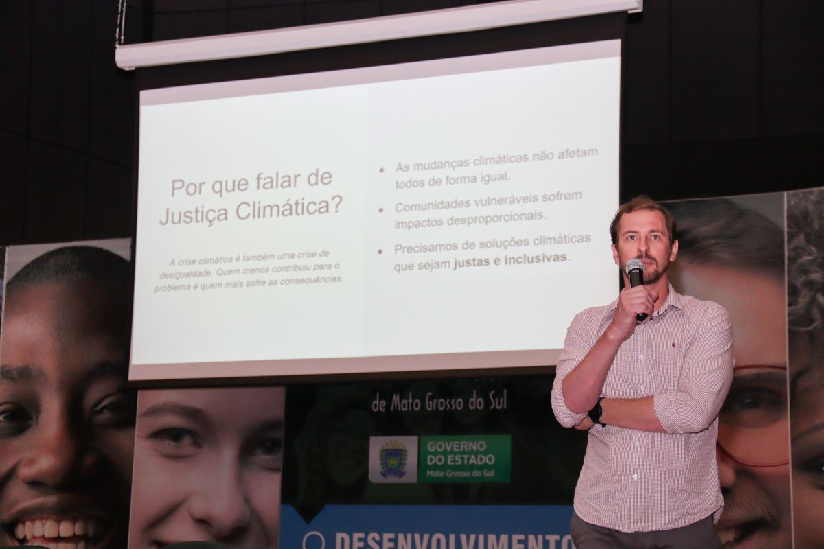 O biólogo Luiz Henrique Ortelhado Valverde, representante da SED, conduziu a palestra “Políticas Públicas e Educação Ambiental: Caminhos para um Mato Grosso do Sul Sustentável”, dentro do eixo de governança e educação ambiental. Ele enfatizou a necessidade de criar mecanismos institucionais para controle social e gestão participativa, bem como a importância da educação ambiental para engajar a sociedade na resposta às mudanças climáticas.