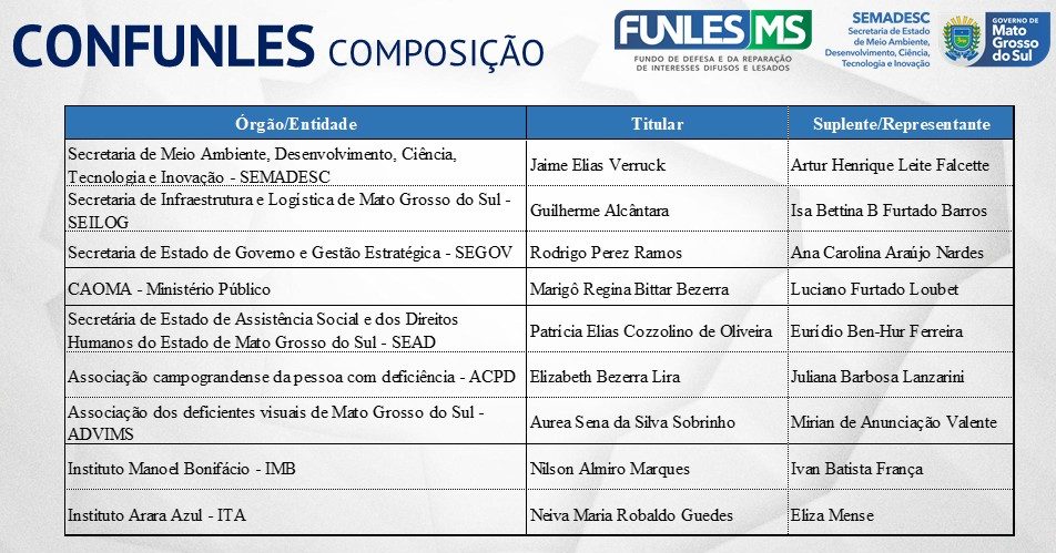 O CONFUNLES é gerido pelo Senhor Jaime Elias Verruck, Secretário Estado do Meio Ambiente, Desenvolvimento, Ciência, Tecnologia e Inovação, na qualidade de Presidente Nato.