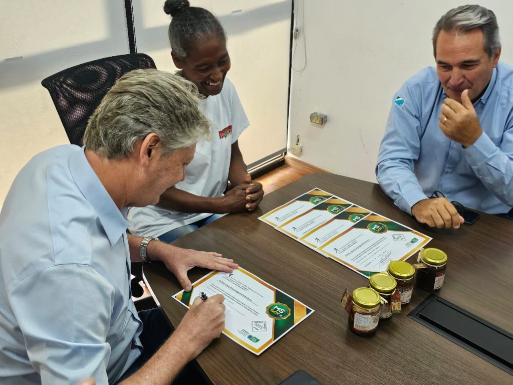 Cinco variedades de doce de leite produzidas pela Agroindústria Pé da Serra, localizada no Assentamento Santa Lúcia, em Bonito, contam agora com o Selo Arte, certificação que permite a comercialização dos produtos em todo o território nacional. A entrega dos certificados foi realizada na manhã desta segunda-feira (23) pelo secretário Jaime Verruck, da Semadesc (Secretaria de Meio Ambiente, Desenvolvimento, Ciência, Tecnologia e Inovação), pelo secretário-executivo de Desenvolvimento Econômico Sustentável, Rogério Beretta e pelo coordenador de Pecuária, Marivaldo Miranda.