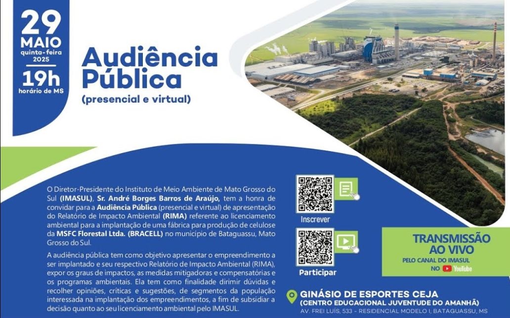 • O Imasul (Instituto de Meio Ambiente de Mato Grosso do Sul), vinculado à Semadesc (Secretaria de Meio Ambiente, Desenvolvimento, Ciência, Tecnologia e Inovação), realizará no dia 29 de maio, às 19h, uma audiência pública para discutir os impactos ambientais, sociais e econômicos da nova planta industrial da Bracell, que deverá ser instalada no município de Bataguassu. O encontro acontecerá no Ginásio de Esportes do CEJA, localizado na Avenida Frei Luís, 533, no Residencial Modelo I. A audiência integra etapa obrigatória do processo de licenciamento ambiental do empreendimento.