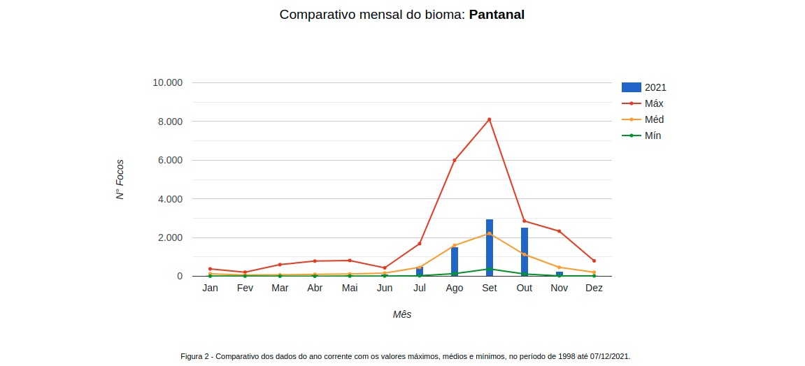 Em 2021, o mês de setembro apresentou o pico de incêndios no Pantanal com quase 3 mil focos. Porém desde junho, com início da estiagem, a situação já mostrava piora (ver gráfico). Em outubro começou a redução no número de focos e em novembro, com a volta da regularidade das chuvas, a situação se normalizou.