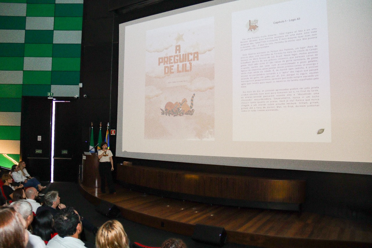 Durante sua apresentação, Mariana Mirault compartilhou com o público o processo de criação dos livros, detalhando cada etapa, desde a concepção da personagem e o enredo até a fase de ilustração. A estrutura narrativa foi pensada para seguir os elementos clássicos de uma boa história, com a estruturação da personagem, conflito, clímax e solução, “tudo isso misturado com uma pitadinha de ciência”. Ela mostrou ainda como o projeto foi formalizado dentro da Semadesc e como envolveu diferentes áreas e instituições parceiras, como o Imasul, a SED (Secretaria de Educação), universidades e municípios.