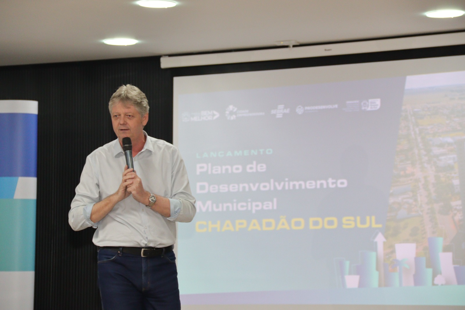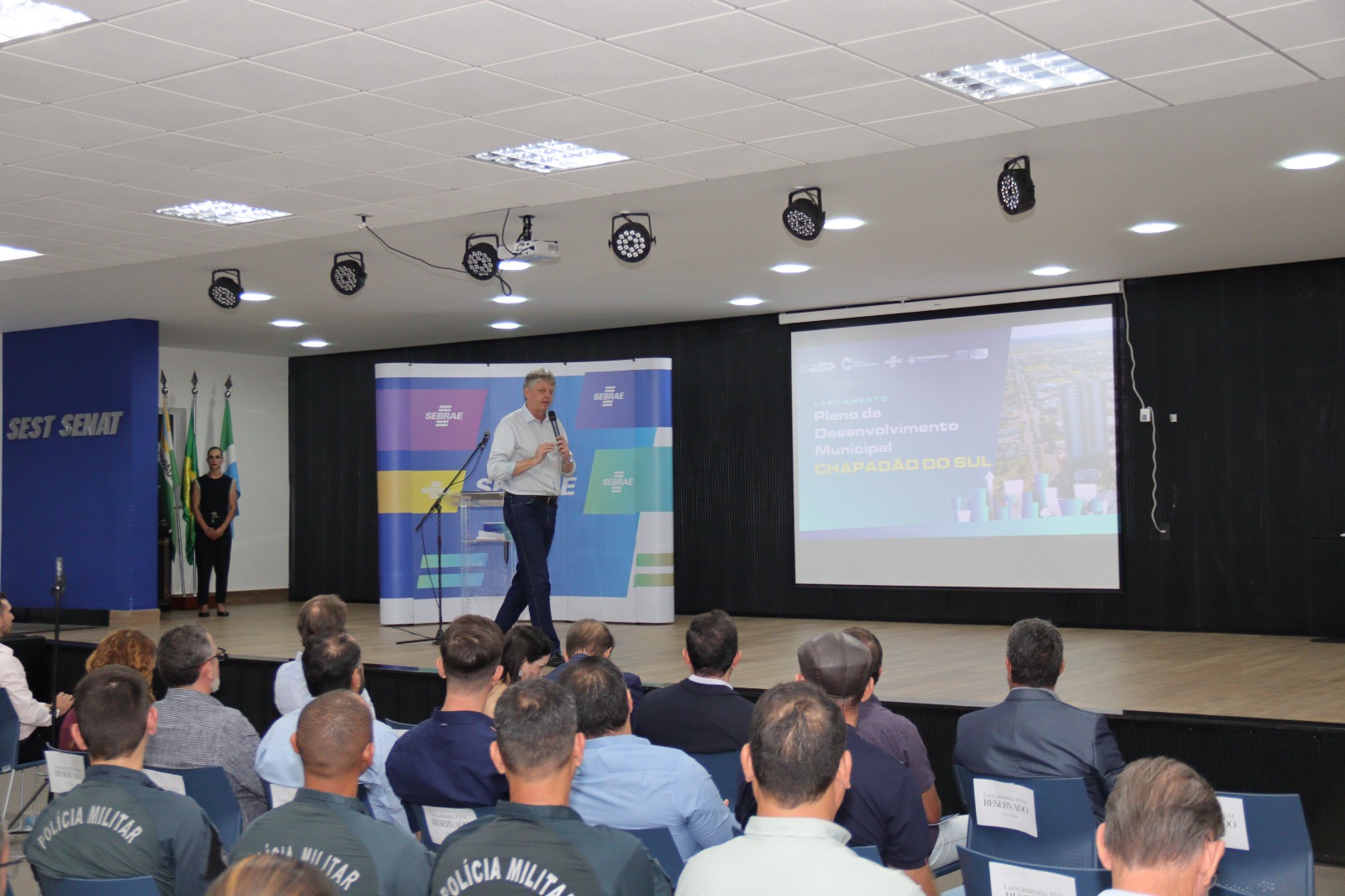 • O secretário de Estado de Meio Ambiente, Desenvolvimento, Ciência, Tecnologia e Inovação (Semadesc), Jaime Verruck, destacou o planejamento como pilar da gestão pública durante o lançamento do Plano de Desenvolvimento Municipal (PDM) de Chapadão do Sul, realizado nesta segunda-feira (10), no Sest Senat. A iniciativa é do Sebrae/MS, em parceria com o Governo do Estado e a Prefeitura Municipal, e integra as ações do programa Cidade Empreendedora.