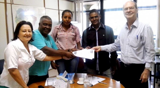 Adriano Santos da Silva, Presidente da Associação de Pequenos produtores Rurais de Furnas do Dionizio (Asfurnas), do município de Jaraguari, Antônio Borges dos Santos, do Conerq/MS, Zenaide Centurião Barros, Secretaria Municipal de Educação e Luciane Prado dos Santos, Diretora de Cultura de Jaraguari, trouxeram diversas solicitações, entre as quais, a organização de encontros para discutir os projetos e programas para investimento nas comunidades quilombolas do Estado, a ampliação do credito rural, e melhorias nas condições de aplicação do Pronaf.