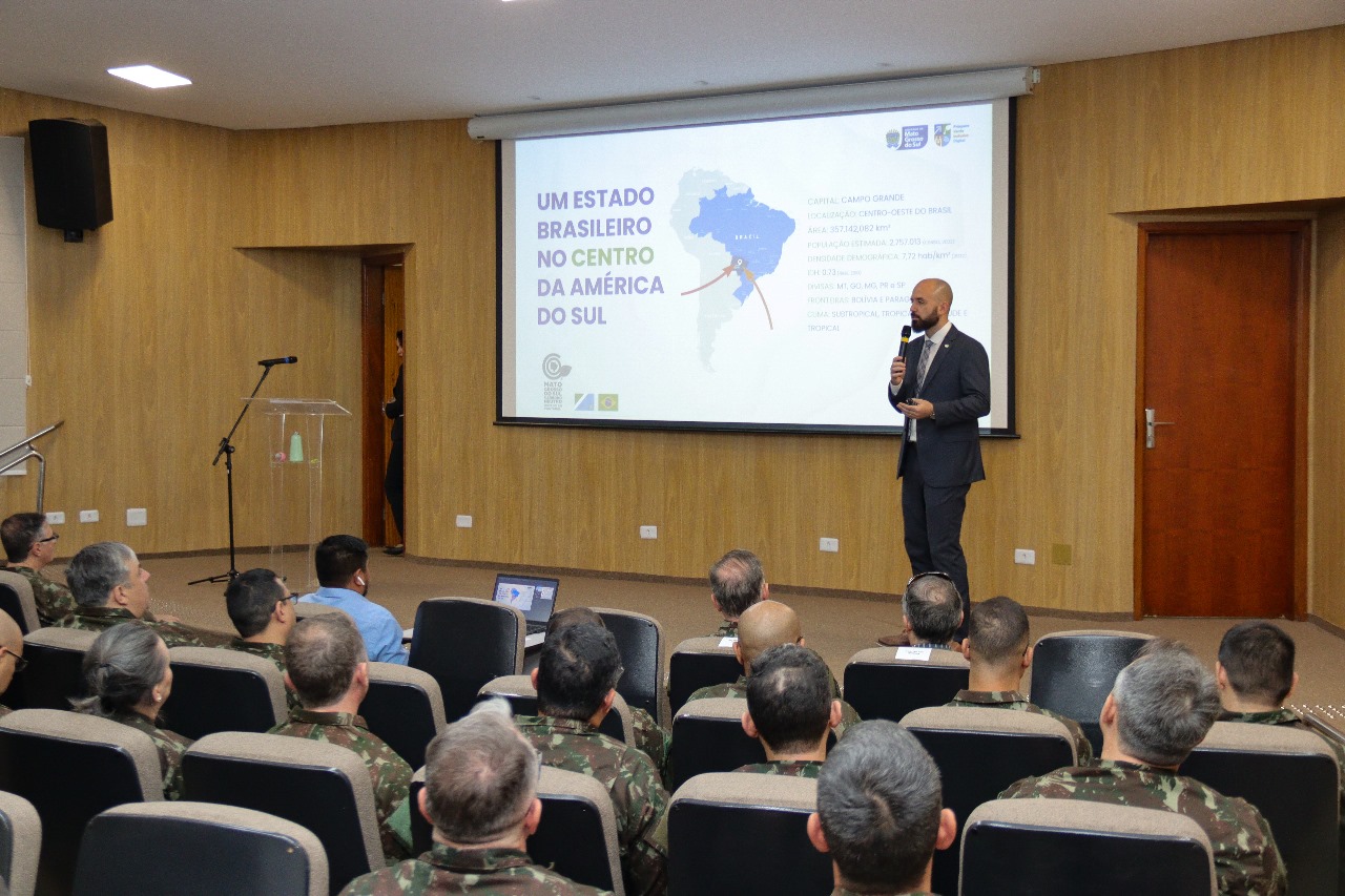 O secretário-adjunto da Secretaria de Estado de Meio Ambiente, Desenvolvimento, Ciência, Tecnologia e Inovação (Semadesc), Artur Falcette, apresentou hoje (13) aos alunos da Escola de Comando e Estado-Maior do Exército (ECEME) um panorama sobre os desafios e oportunidades de Mato Grosso do Sul no cenário político nacional.