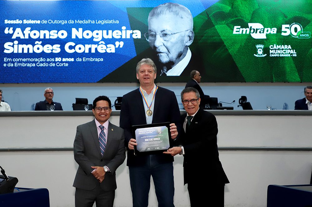 A honraria foi entregue pelo chefe-geral da Embrapa Gado de Corte, Antonio do Nascimento Ferreira Rosa (Toti) e pelo presidente da Câmara, vereador Epaminondas Vicente Neto (Papy). “Esse é um momento de refletir sobre o que seria da pecuária brasileira sem o papel da Embrapa. Nossa pecuária é o que é hoje porque a Embrapa Gado de Corte contribuiu na melhoria das pastagens, genética, manejo e tecnologias. Se o Brasil se tornou um país exportador global e competitivo, é graças ao trabalho de profissionais que se dedicaram e ainda se dedicam à pesquisa. Uma pecuária atrasada talvez não fosse criticada, mas certamente não teria alcançado o patamar mundial que conquistamos”, comentou o secretário Jaime Verruck após receber a homenagem.