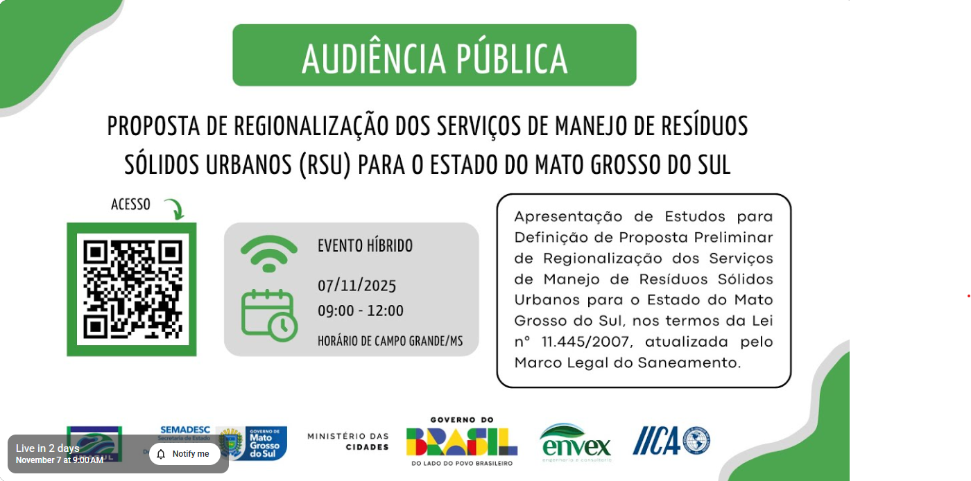 O Governo do Estado de Mato Grosso do Sul, por meio da Semadesc (Secretaria de Meio Ambiente, Desenvolvimento, Ciência, Tecnologia e Inovação) e do Imasul (Instituto de Meio Ambiente de Mato Grosso do Sul), realizam na sexta-feira (7), Audiência Pública sobre a Regionalização dos Serviços de Manejo de Resíduos Sólidos Urbanos. A audiência acontecerá das 9h às 12h, no auditório do Imasul, em Campo Grande, com transmissão online pelo canal do Instituto no YouTube: https://www.youtube.com/watch?v=r-Sa9igWXDY.