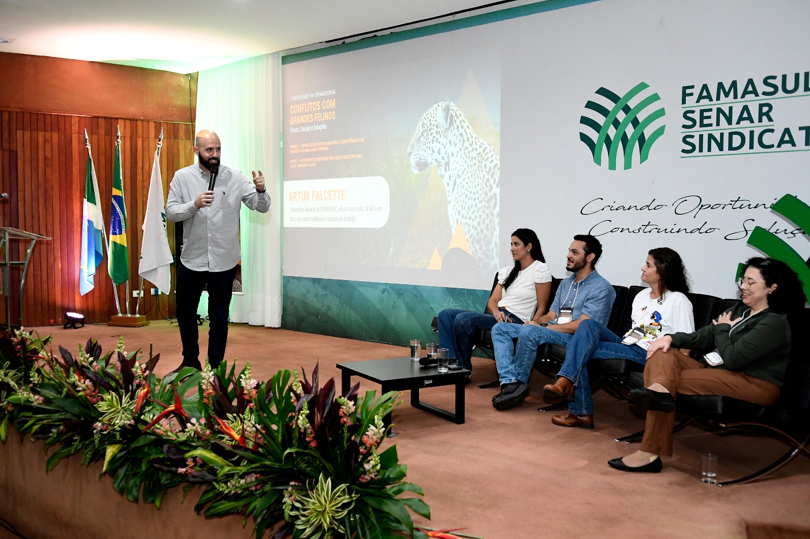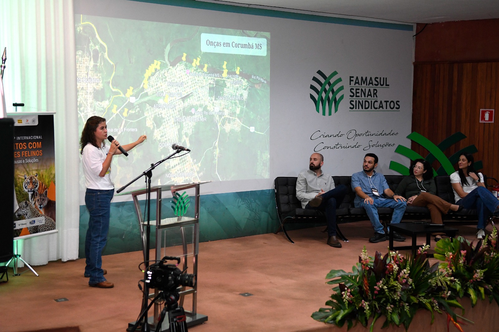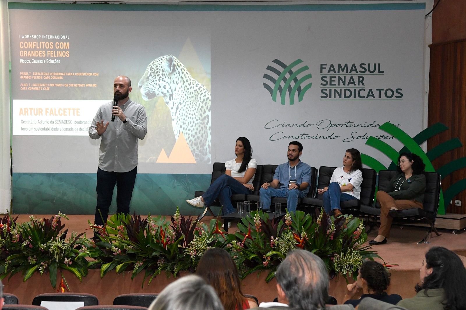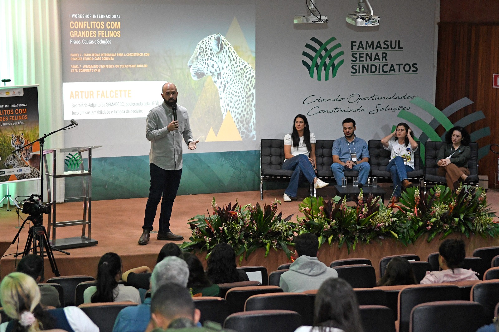 Grasiela Porfírio, gestora do Instituto Homem Pantaneiro, articula pesquisa, comunidades e políticas públicas para coexistência com felinos no Pantanal; Fabiane Souza Analista Ambiental na Superintendência do IBAMA do estado de Mato Grosso do Sul, atua na prevenção de conflitos com felinos; Cristina Fleming, secretária municipal de Meio Ambiente de Corumbá, engenheira ambiental com experiência em gestão ambiental de cidades; e Artur Falcette, secretário-Adjunto da Semadesc, doutorando pela UFGD com foco em sustentabilidade e tomada de decisão.